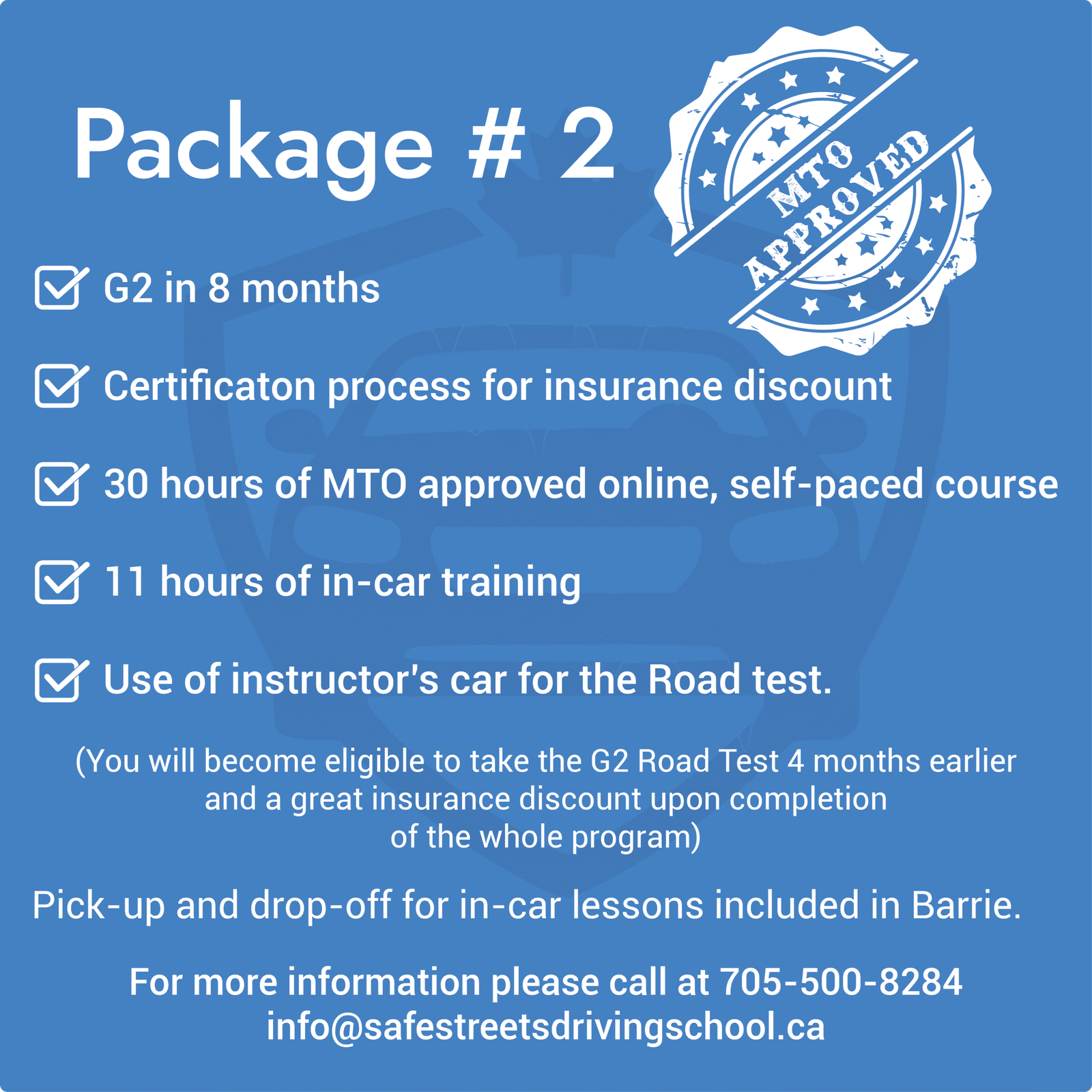 • Please note that you may get an insurance discount after completion of the course to get  MTO certification, the online course and in-car Lessons must be completed within 1 year of receiving access to the online course, or else the MTO certificate will not be issued.